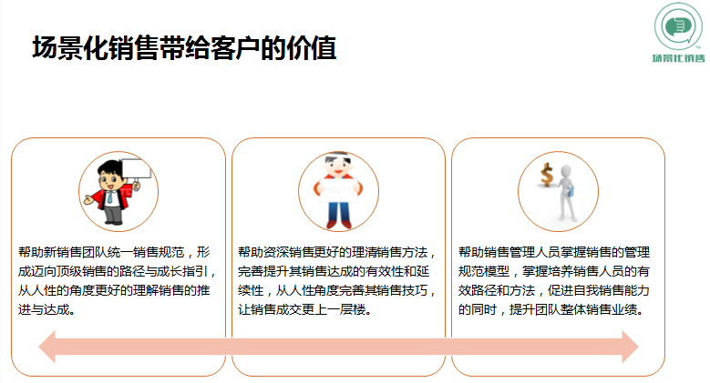 本课程帮助所有从事项目式销售的学员建立从陌生到成交的大客户销售路径,并在具体的销售场景中持续模拟演练,同时辅以六项关键技能的不断组合练习,提升学员的成交达成率和持续客户价值获取,也为组织收获卓越的市场回报。逻辑思路:充分准备-亲和开场-探询需求-构建方案-达成成交-跟进发展。以全球最顶级的顾问式销售理论为核心,把销售流程、核心能力、客户场景三维融合,工具+模拟+示范+研讨多种教学手段应用,场景卡、技能卡、角色卡多种辅助教学道具,营造教学氛围,提升学效转化,让学员在场景推进中自然而然地达成成交,并持续扩大成果。