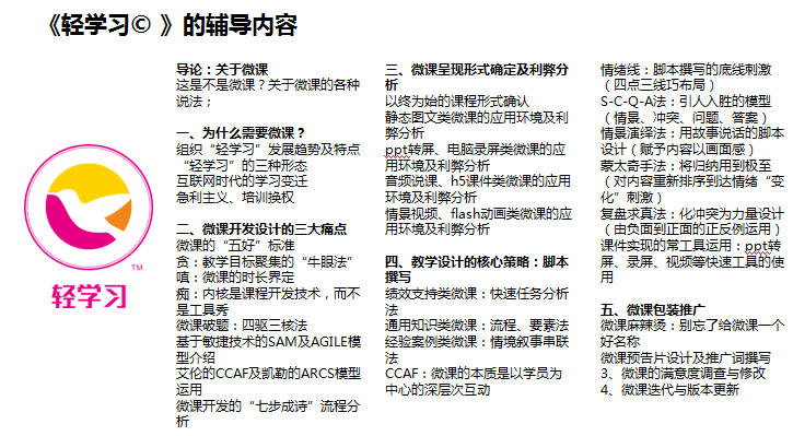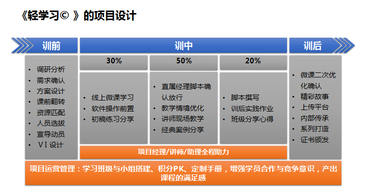 《轻学习》是基于《6Ds 》的逻辑开发,主要针对线上的微课开发的学习项目。通过训前、训中到训后的完整项目设计,弥补了纯线上学习参与感不足的劣势,在不增加高额师资课酬成本的同时,提高成果产出效率。《培训审批》:根据菲尼克斯大学的研究,培训效果中26%来自训前的学习,50%来自训后的强化措施,而 企业85%的资金都投入在的是剩余24%培训效果的训中。